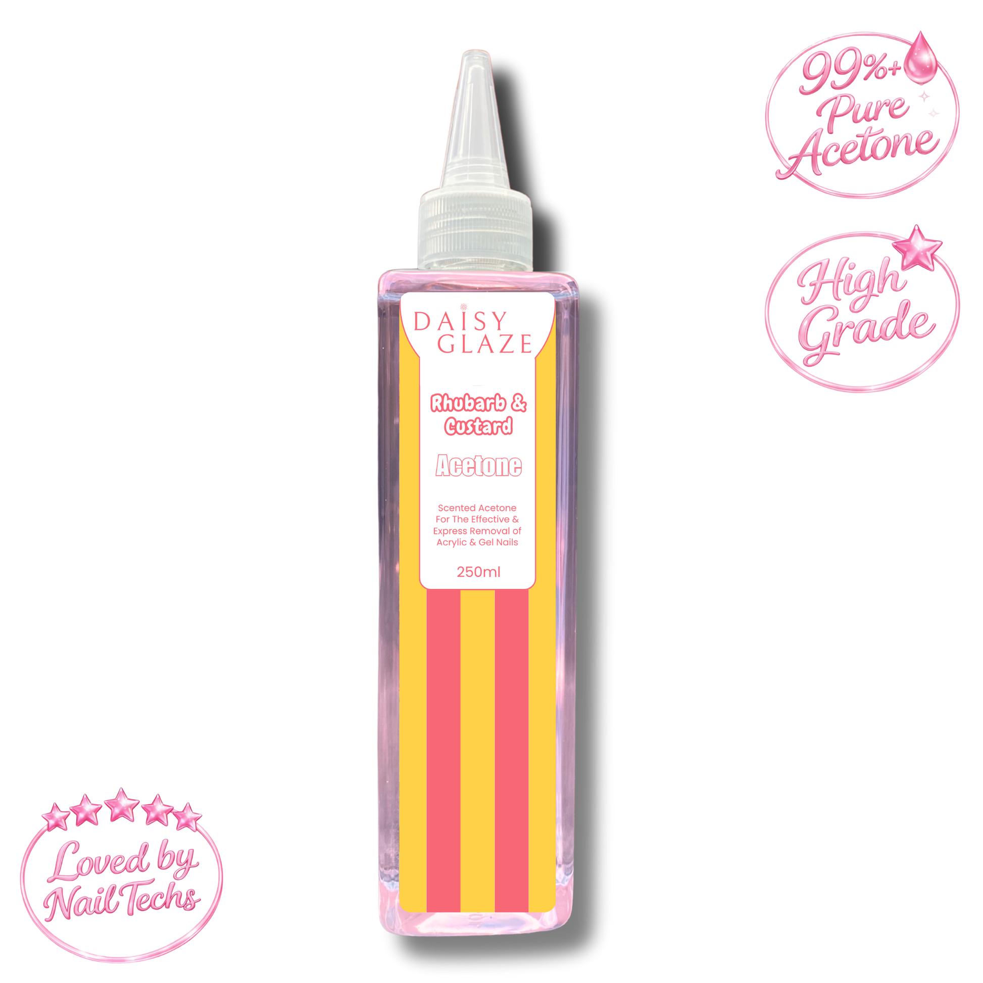 Add a sweetshop classic to your removal routine with Rhubarb & Custard Acetone – 250ml, a professional-grade, high-strength acetone infused with the nostalgic rhubarb & custard fragrance. Designed for fast, effective soak-off, it removes gel polish, BIAB, builder gel and acrylic while helping reduce harsh acetone fumes in the salon 💅🍭